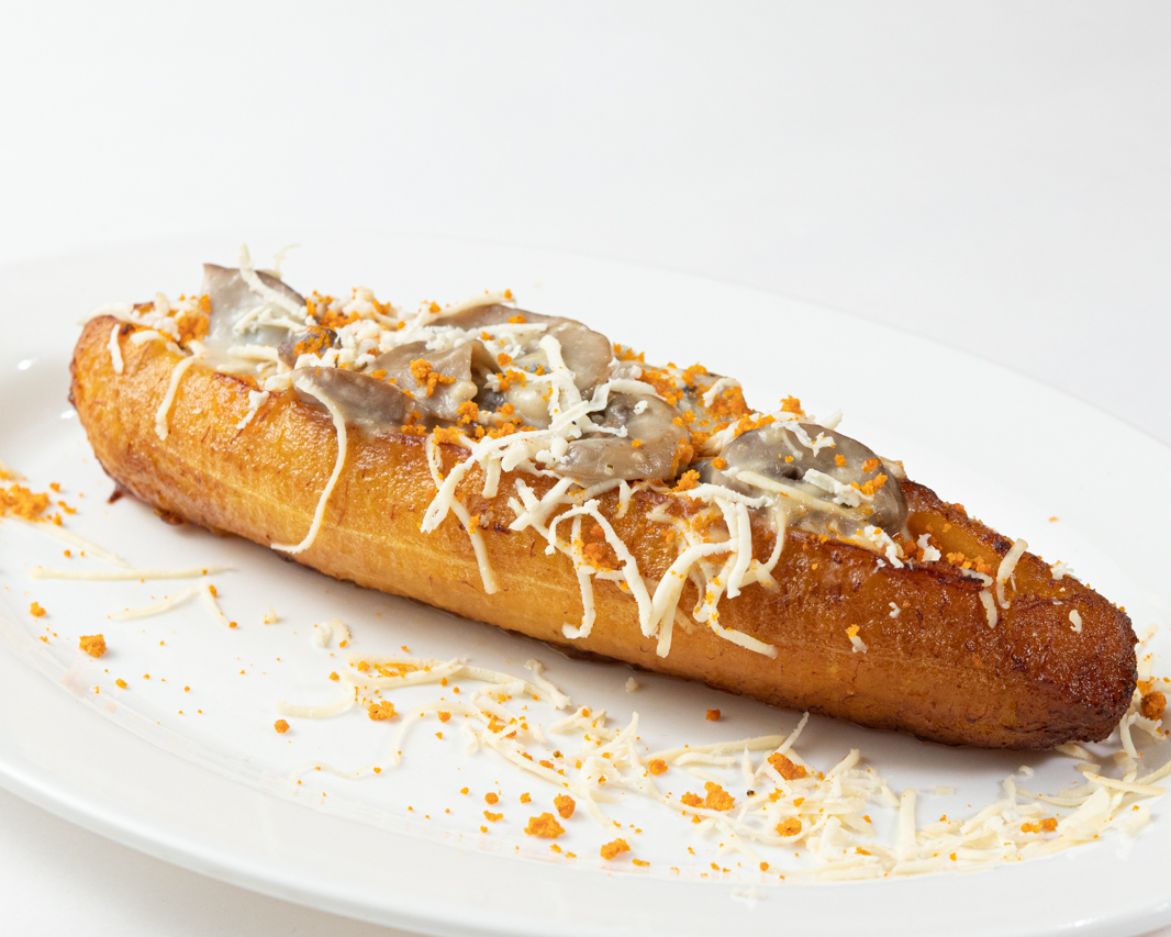 Maduro con salsa de cahmpiñones + queso rallado y un toque de salprieta